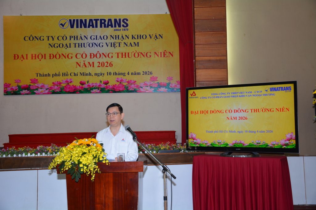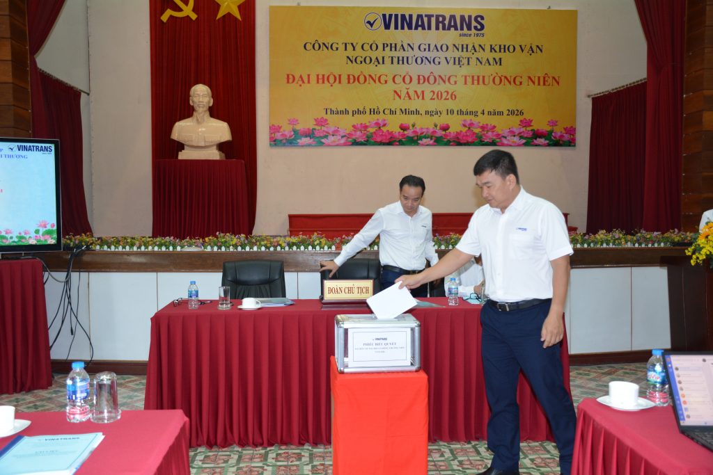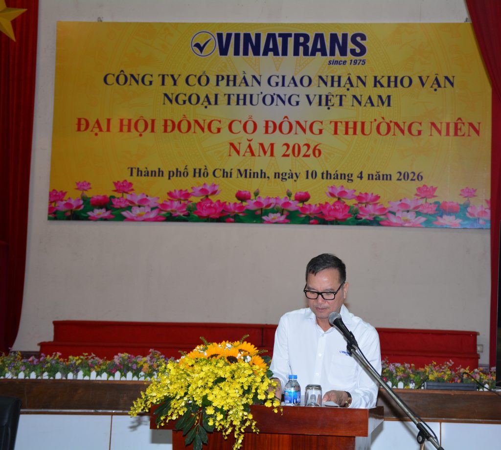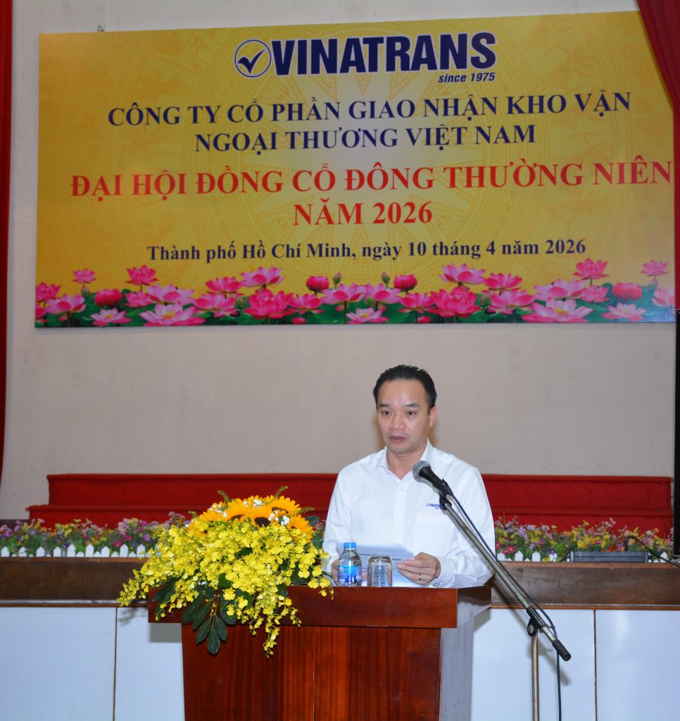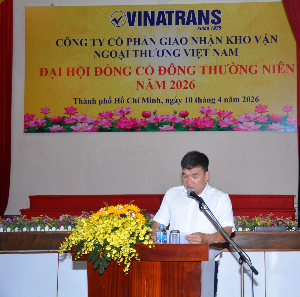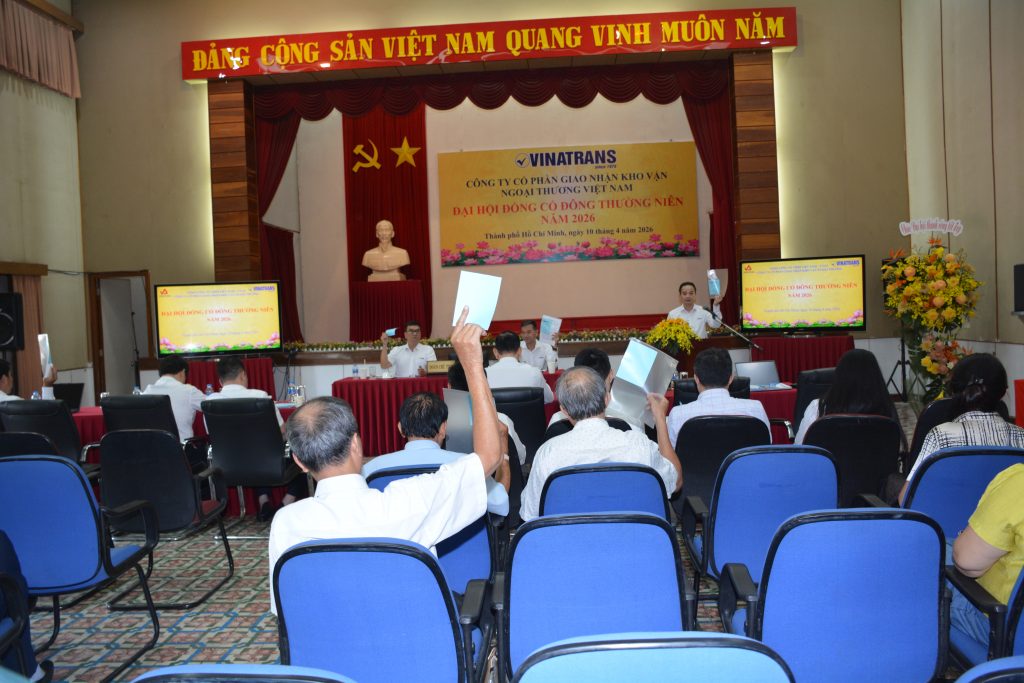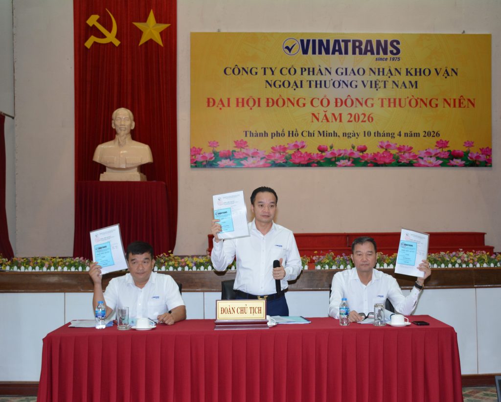 Hôm nay, ngày 10/4/2026, tại văn phòng công ty hội trường Lầu 6, số 56 Thủ Khoa Huân, P. Bến Thành, Tp. HCM, Công ty Cổ phần Giao nhận Kho vận Ngoại thương Việt Nam (Vinatrans) long trọng tổ chức Đại hội đồng cổ đông thường niên năm 2026 của Công ty, nhằm đánh giá kết quả thực hiện Nghị quyết Đại hội đồng cổ đông năm 2025; kế hoạch năm 2026 và thông qua các Báo cáo, Tờ trình của Hội đồng quản trị và Ban kiểm soát trước Đại hội.